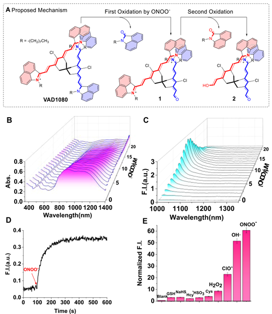 圖3.(A)VAD1080對氧化物種的檢測機制。(B)在H2O:DMF(v/v =1:1,含1%TFA)的混合物中,VAD1080(20μM)對ONOO-的吸收滴定和(C)熒光滴定。λex=940 nm。(D)VAD1080(20μM)與ONOO-的反應(yīng)動力學(xué)。(E) VAD1080(20μM)對各種生物硫化物(每個物種5當量)和不同氧化物種的熒光響應(yīng)。(H2O2:5當量;·OH:1當量;ClO-:0.5當量;ONOO-:0.5當量。)