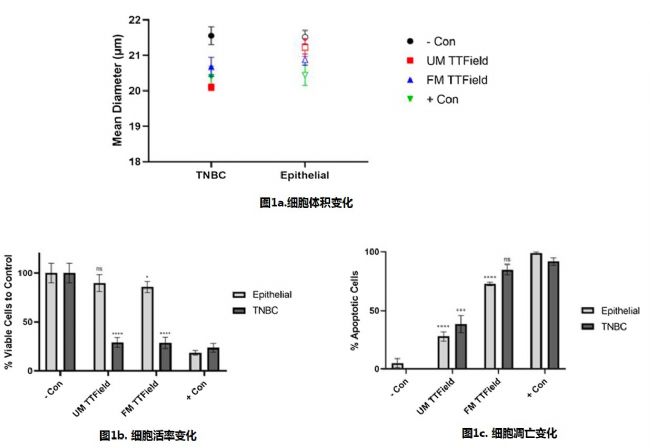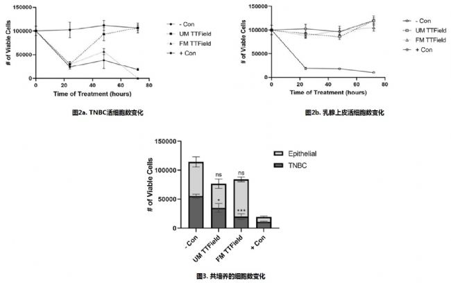 在UMTTFields和FM TTFields處理24h后,TNBC表現(xiàn)出明顯的粒徑減少(圖1a,細胞早凋的一個明顯標志)和活率降低(圖1b),F(xiàn)M TTFields處理下的TNBC凋亡率明顯升高(圖1c)。而上皮細胞受影響相對較小。72h后,在FM TTFields作用下,TNBC基本全部死亡,而乳腺上皮細胞基本無影響。共培養(yǎng)的細胞,在UM TTFields和FM TTFields作用24h后,其結(jié)果與單獨培養(yǎng)的細胞結(jié)果相類似(圖3)。