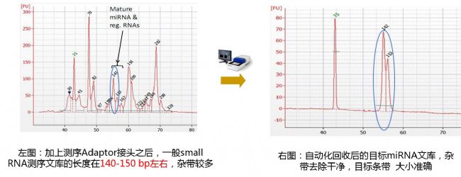Small RNA是一類長(zhǎng)約20~30個(gè)核苷酸的非編碼RNA分子,包含miRNA 、siRNA和piRNA等,是一大類調(diào)控分子,幾乎存在于所有的生物體中。因此如何準(zhǔn)確回收small DNA,減少其他非目標(biāo)DNA就成為實(shí)驗(yàn)的關(guān)鍵因素。small RNA文庫加上adapter接頭后其長(zhǎng)度一般在140-150bp左右,前后存在大量雜帶,用Blue Pippin系列產(chǎn)品可以精準(zhǔn)回收相關(guān)片段,將雜帶徹底去除干凈,有效提高測(cè)序質(zhì)量和效率。(圖1)
