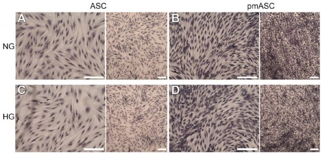 圖1 在基礎(chǔ)培養(yǎng)基(ASC)或周細(xì)胞培養(yǎng)基(pmASC)中培養(yǎng)的人脂肪間充質(zhì)干細(xì)胞的代表性顯微照片,在細(xì)胞增殖測定期間用結(jié)晶紫染色。在各自的培養(yǎng)基中生長三天后,在一些樣本(高葡萄糖,25 mM)中添加葡萄糖,而其他樣本則保持在正常葡萄糖(NG)狀態(tài)。在葡萄糖添加72小時(shí)后拍攝照片,并與NG對照進(jìn)行比較。四個(gè)亞組為A:ASC NG;B: pmASC NG;C: ASC HG;D: pmASC HG。