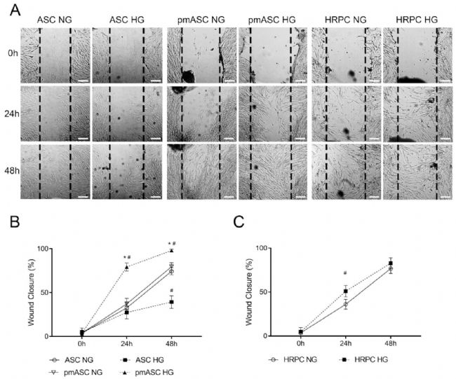 接下來,與HRPCs相比,進(jìn)行了傷口愈合測定以評估不同ASC亞組的細(xì)胞遷移能力(圖2 A)。數(shù)據(jù)顯示,在NG條件下培養(yǎng)時(shí),ASCs和pmASCs在48小時(shí)的觀察期內(nèi)表現(xiàn)出顯著的遷移能力,傷口愈合率約為70%(圖2 B)。將葡萄糖加入培養(yǎng)基(HG)時(shí)觀察到顯著差異,與pmASCs相比,ASCs(傷口愈合率約為35%)明顯顯示出相反的趨勢。在傷口愈合率約為70% 的HRPCs 中觀察到中間值(圖2 C)。HG條件下,pmASCs的相關(guān)細(xì)胞遷移能力在48小時(shí)時(shí)尤為明顯。