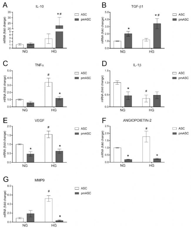 此外,評估了血管生成因子VEGF,血管生成素-2和MMP9的mRNA表達(dá)水平。在HG培養(yǎng)的ASC中,VEGF和血管生成素-2值均增加,而在pmASCs中的較低水平未受顯著影響。MMP9 mRNA在NG條件下水平較低,添加葡萄糖后在ASCs中顯著更高,在pmASCs中甚至更低。這些數(shù)據(jù)表明,炎癥基因的調(diào)節(jié)有利于抗炎表型,同時(shí),血管生成因子普遍降低。