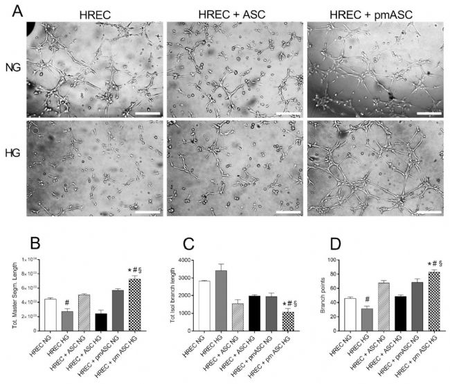 圖4 高葡萄糖對人視網(wǎng)膜內(nèi)皮細(xì)胞(HREC)或與ASCs(HREC + ASC)或pmASCs(HREC + pmASC)共培養(yǎng)的管狀結(jié)構(gòu)形成的影響。(A)代表性顯微照片顯示了每個(gè)樣本的基質(zhì)膠中的3D培養(yǎng)物。底部的直方圖顯示total master segment length “總主干長度”(B)、total isolated branch length“總分離分支長度”(C)和branching points “分支點(diǎn)”(D)。