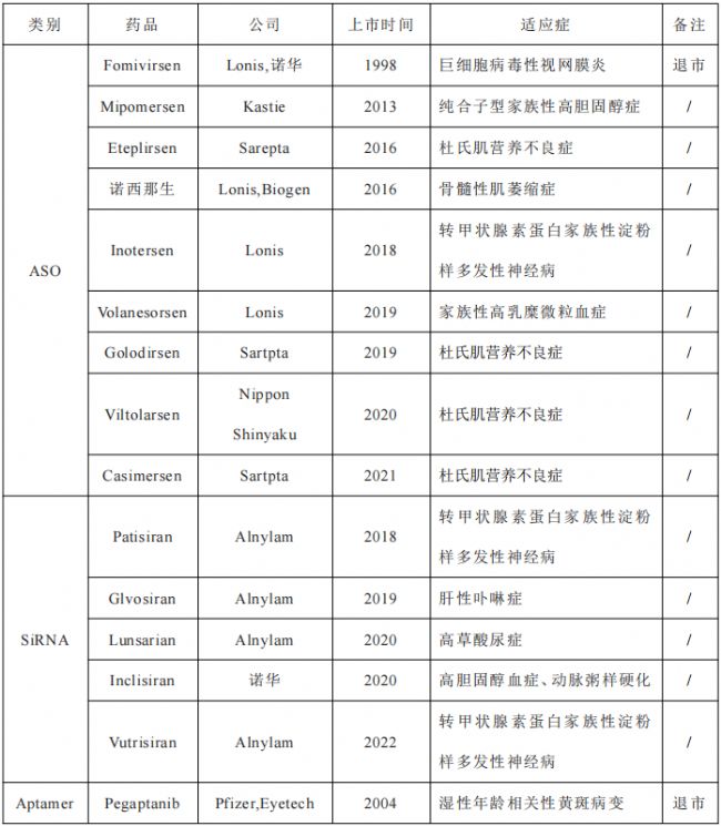 自1998年Ionis/Novartis公司的Fomivirsen批準(zhǔn)上市以來,全球共有十余款小核酸藥物獲批上市,其中渤健與Ionis開發(fā)的Nusinersen是全球首個(gè)用于治療脊髓性肌萎縮癥的藥物,諾華與Alnylam開發(fā)的Inclisiran是一款長效降脂藥,一年僅需注射兩次,開啟了小核酸藥物應(yīng)用于常見慢性病的新篇章。