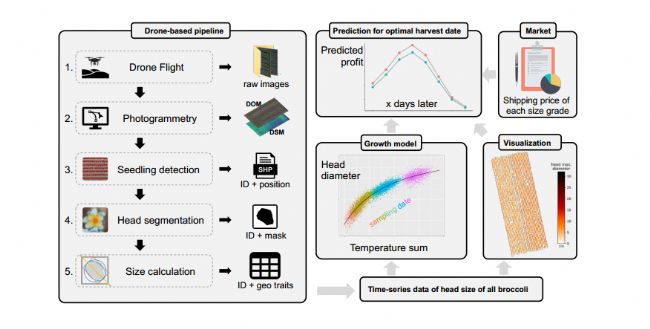 本研究開發(fā)了一套完整的流程,通過使用無人機(jī)遙感和圖像分析,能夠自動(dòng)、無損地準(zhǔn)確估計(jì)和預(yù)測每個(gè)西蘭花(Brassica oleracea L.)頭部的大小(圖1)。所產(chǎn)生的西蘭花頭部尺寸被用作基于溫度的生長模型的數(shù)據(jù)源。最后,根據(jù)市場價(jià)格調(diào)查,建立了利潤預(yù)測模型。為了解決器官級(jí)分析質(zhì)量不足的問題,將感興趣區(qū)域(ROI)向原始無人機(jī)圖像進(jìn)行了反向投影,得到了質(zhì)量較好的無人機(jī)圖像。為了解決省力深度學(xué)習(xí)分析的挑戰(zhàn),本文通過YOLOv5(檢測任務(wù))和BiSeNetv2(分段任務(wù))將時(shí)間序列數(shù)據(jù)融合、主動(dòng)學(xué)習(xí)、遷移學(xué)習(xí)和數(shù)據(jù)增強(qiáng)集成到深度學(xué)習(xí)工作流中。