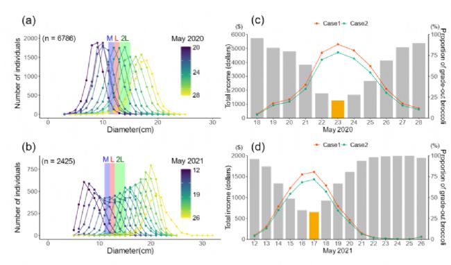 圖4 (a) 2020 年和 (b) 2021 年試驗(yàn)中預(yù)測頭部直徑的分布。M、L和2L尺寸符合日本市場的運(yùn)輸標(biāo)準(zhǔn)(M:11-12厘米,L:12-13厘米,2L:13-15厘米)。假設(shè)在 (c) 2020 年和 (d) 2021 年試驗(yàn)中每個(gè)日期收獲所有個(gè)體,非標(biāo)準(zhǔn)尺寸西蘭花的比例和總收入。黃色柱子表示產(chǎn)生最高收入和最低浪費(fèi)西蘭花的最佳收獲日期。情況1是各等級(jí)之間的價(jià)格差異最大(表示利潤最高),情況2是差異最。ū硎纠麧欁畹停。