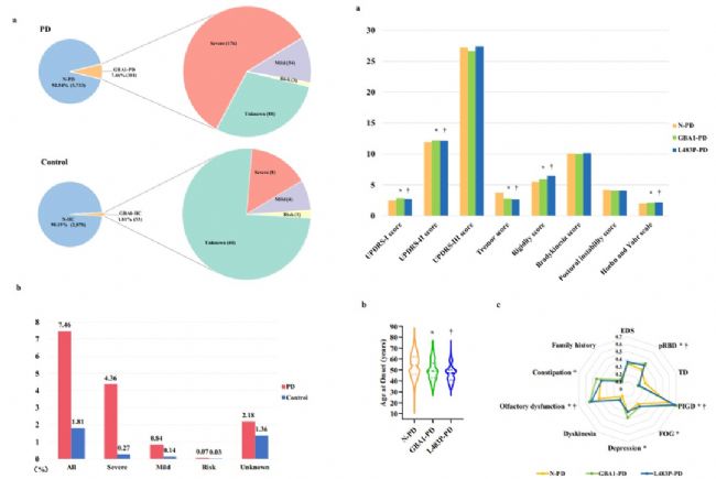 本研究組建了中國人群最大的GBA1-PD臨床研究隊列(301例,其中95例PD患者攜帶GBA1 p.L483P變異),開展了中國GBA1-PD臨床隊列注冊登記研究(CPD-GBAR)(Clinical Trials網(wǎng)站注冊登記號NCT03523065),通過全面的臨床評估(包含運動癥狀、非運動癥狀以及運動并發(fā)癥等)和隨訪觀察,發(fā)現(xiàn)與未攜帶GBA1基因變異的PD患者相比,攜帶GBA1基因變異的PD患者發(fā)病年齡更早(發(fā)病年齡平均提前了4年)、運動癥狀更重,更容易出現(xiàn)快速眼動睡眠行為障礙(RBD)、嗅覺功能障礙、認(rèn)知功能障礙、抑郁和自主神經(jīng)功能障礙等,揭示了中國人群攜帶GBA1基因變異的PD患者臨床表型特征(基因型-表型特征)。