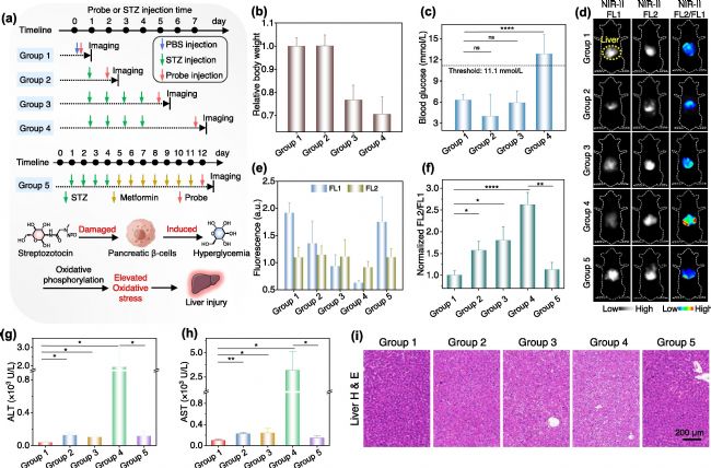 圖4.(a)RNP2用于糖尿病小鼠成像和給藥程序的方案。(b)糖尿病小鼠在不同時(shí)間點(diǎn)的相對體重。(c)1-4組小鼠的血糖濃度(ns:無顯著差異,****:P<0.0001,ANOVA)。當(dāng)平均血糖濃度被確定為大于11.1mmol/L時(shí),認(rèn)為小鼠中已經(jīng)發(fā)生糖尿病。(d)靜脈注射RNP2 10分鐘后,1-5組小鼠的FL1、FL2和比率FL2/FL1圖像。FL1激發(fā)波長:808 nm,F(xiàn)L2激發(fā)波長:980 nm。發(fā)射波長:1100-1700 nm。黃色曲線表示肝臟區(qū)域。(e, f)靜脈注射RNP2 10分鐘后,第1-5組小鼠的歸一化FL1、FL2和FL2/FL1比率的量化。(g, h)1-5組小鼠的ALT和AST濃度。(i)1-5組小鼠肝臟的代表性H&E染色切片。