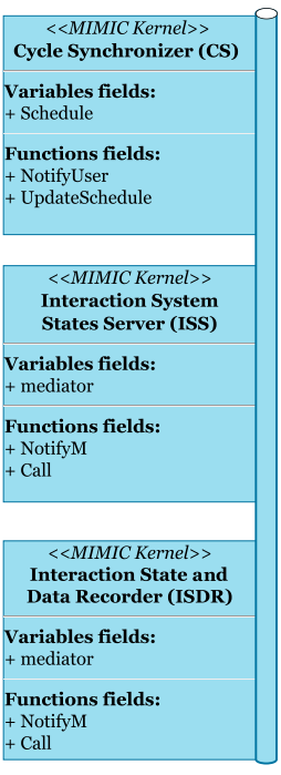 圖2MIMIC的內(nèi)核 UML表示,描述了通過(guò)通信總線(藍(lán)色圓柱體)鏈接的MIMIC主要組件(周期同步器、交互狀態(tài)和數(shù)據(jù)記錄器以及交互系統(tǒng)狀態(tài)服務(wù)器)的數(shù)據(jù)結(jié)構(gòu)。
