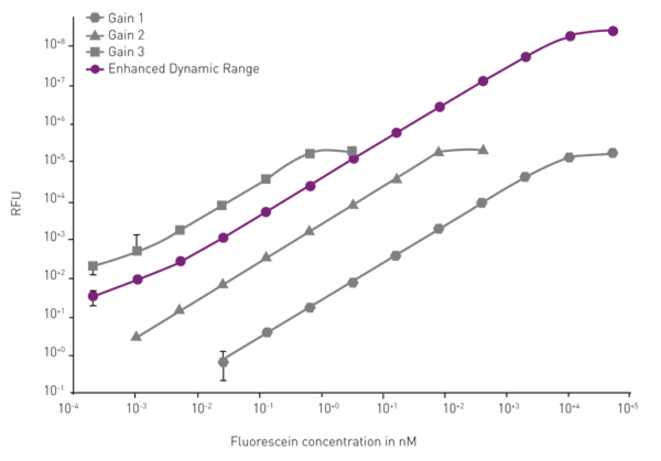 如果熒光酶標(biāo)儀支持較大的動(dòng)態(tài)范圍,可在單次運(yùn)行中讀取差異很大的樣品,避免試出正確的稀釋倍數(shù)和熒光增益比率所造成的試劑和時(shí)間浪費(fèi)。BMG LABTECH的 CLARIOstar® Plus和VANTAstar® 酶標(biāo)儀配備的動(dòng)態(tài)范圍擴(kuò)展技術(shù)(EDR)提供具有競(jìng)爭(zhēng)力的動(dòng)態(tài)范圍(8個(gè)數(shù)量級(jí)濃度),可在單次運(yùn)行中自動(dòng)測(cè)量極弱和極強(qiáng)的信號(hào),無需進(jìn)行調(diào)節(jié)(圖 2)。