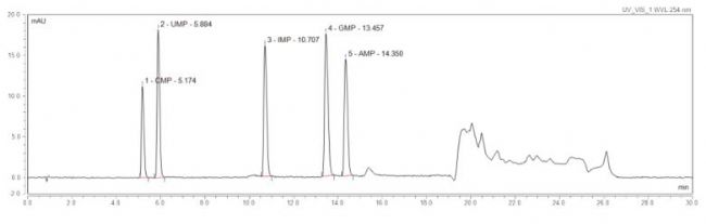 在低血清、無血清細胞培養(yǎng)基中,為滿足細胞生長增殖需要,常常添加一些成份:蛋白質、多肽、核苷、嘌呤、檸檬酸循環(huán)的中間產物、脂類、及一些血清替代因子等。隨著細胞的不斷分裂,DNA不斷復制,細胞內部原有的的核苷酸不足以保證DNA的順利完成復制時,就必須要從培養(yǎng)基中攝取核苷酸供細胞的DNA復制需要。采用Vanquish Duo HPLC系統(tǒng),Hypercarb石墨化碳色譜柱,UV檢測器測定5種核苷酸。