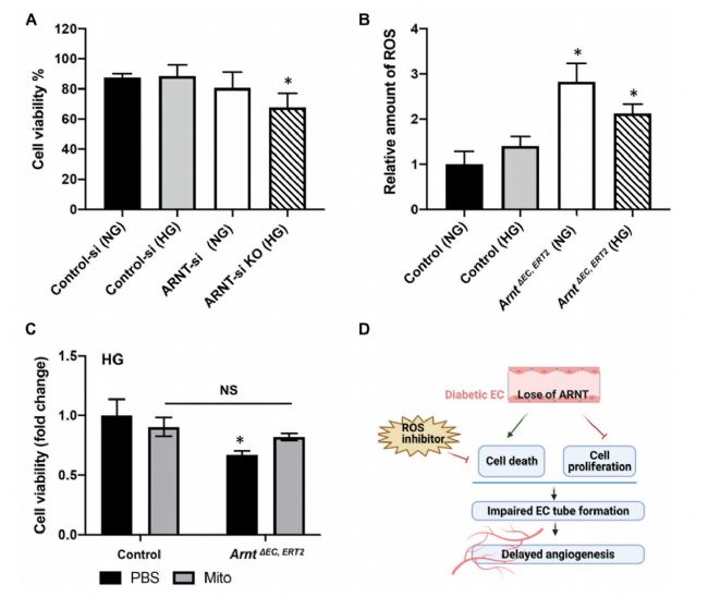 (A)如所示,HUVECs中存在HG或NG培養(yǎng)基時(shí),處理組用siRNA轉(zhuǎn)染誘導(dǎo)ARNT敲低,對照組為control-si。(B)高糖條件下,處理組Arnt△EC,ERT2 和對照組Arntfl/fl WT小鼠分離的MMVECs中ROS水平。(C) Mito-TEMPO抑制ROS對細(xì)胞活力的影響。從處理組Arnt△EC,ERT2 和對照組Arntfl/fl WT小鼠中分離的MMVECs在HG培養(yǎng)基中培養(yǎng)48 h,然后給予0.5μM的Mito-TEMPO 24 h。使用Moxi GO II測定細(xì)胞活力。數(shù)據(jù)以mean±SEM表示(每組n = 6-8)。*P <0.01. (D)內(nèi)皮細(xì)胞ARNT在糖尿病血管生成中的作用示意圖。