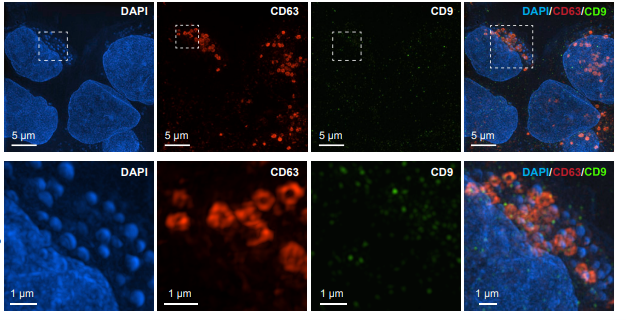 圖7. 多色結(jié)構(gòu)照明顯微鏡(SIM)免疫熒光顯示外泌體定位于DAPI+微核,同時表達CD63和CD9