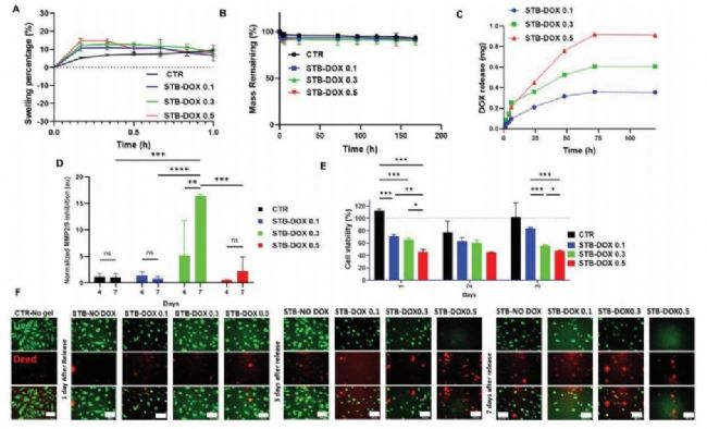 為避免損害周圍的動(dòng)脈組織,隨著時(shí)間的推移,監(jiān)測(cè)水凝膠在磷酸鹽緩沖鹽水(PBS)中孵育時(shí)的溶脹率(%)(圖4A),結(jié)果表明,所有STB條件在前20 min內(nèi)達(dá)到最大腫脹,并在研究的剩余時(shí)間內(nèi)保持平衡。為了檢測(cè)復(fù)合水凝膠的降解性,將STBs在37°C的PBS中孵育175小時(shí)(圖4B)。在PBS中,以37°C檢測(cè)STBs中DOX的釋放譜(圖4C),所有配方在6h內(nèi)均出現(xiàn)爆發(fā)性釋放,在72 h內(nèi)持續(xù)釋放,釋放速率逐漸衰減。通過(guò)MMP活性對(duì)內(nèi)皮細(xì)胞和巨噬細(xì)胞活性的影響和細(xì)胞毒性進(jìn)行評(píng)估(圖4D、E)。活死染色結(jié)果顯示,當(dāng)DOX濃度增加到0.5% w/v時(shí),死細(xì)胞(紅色)的數(shù)量多于活細(xì)胞(綠色)(圖4F)。因此,根據(jù)釋放率、細(xì)胞活力和MMP抑制結(jié)果,選擇STB-DOX 0.1和0.3組進(jìn)行下一步評(píng)價(jià)。