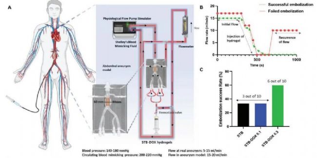腹腔栓塞治療腹主動(dòng)脈瘤(AAAs)在臨床上仍然受到動(dòng)脈內(nèi)膜滲漏復(fù)發(fā)的限制。這些復(fù)發(fā)與內(nèi)皮內(nèi)襯和基質(zhì)金屬蛋白酶(MMPs)介導(dǎo)的動(dòng)脈瘤進(jìn)展導(dǎo)致的再通相關(guān)。因此,來(lái)自美國(guó)川崎生物醫(yī)學(xué)創(chuàng)新研究所的Menekse Ermis、 Ali Khademhosseini與韓國(guó)高麗大學(xué)的Han-Jun Kim聯(lián)合將一種常見的硬化劑和MMPs抑制劑—多西環(huán)素(DOX)結(jié)合到一種剪切變薄生物材料(STB)的血管栓塞水凝膠中,DOX的加入有望通過(guò)抑制MMP活性、促進(jìn)內(nèi)皮清除,同時(shí)防止內(nèi)滲漏。研究結(jié)果表明,含有4.5% w/w硅酸鹽納米血小板和0.3%w/vDOX的STB是可注射的,與沒(méi)有DOX的相比,存儲(chǔ)模量增加兩倍。與未經(jīng)治療的血液相比,STB-DOX水凝膠減少33%的凝血時(shí)間。在體外豬主動(dòng)脈模型中,從水凝膠中爆發(fā)性釋放的DOX在6小時(shí)后顯示出硬化效應(yīng)。7天后,內(nèi)皮細(xì)胞上的水凝膠持續(xù)釋放DOX顯示MMP抑制。該水凝膠成功地阻斷患者來(lái)源的腹部動(dòng)脈瘤模型。多功能STB-DOX水凝膠的硬化和MMP抑制特性可能為有效栓塞血管內(nèi)的動(dòng)脈瘤提供很好的機(jī)會(huì)。