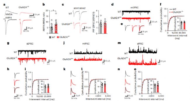 以往研究發(fā)現(xiàn)GluN2B可能通過影響興奮性或抑制性突觸發(fā)揮抗抑郁作用,那么GluN2A是否也存在類似的作用機制?通過電生理實驗發(fā)現(xiàn)與野生型小鼠相比,GluN2A敲除小鼠海馬CA1區(qū)錐體神經(jīng)元興奮性突觸后電流和抑制性突觸后電流并未發(fā)生變化,表明敲除GluN2A并不影響興奮性或抑制性突觸傳遞功能。