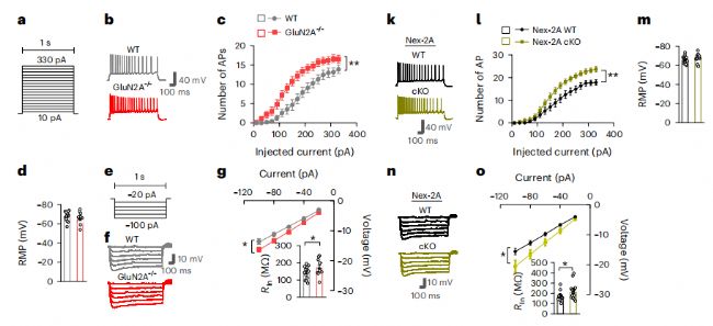 進一步實驗發(fā)現(xiàn)敲除GluN2A增加海馬錐體神經(jīng)元內在興奮性,不影響中間能神經(jīng)元放電活動,表明GluN2A特異性調控興奮性神經(jīng)元放電活動。MK-801或氯胺酮可增加野生型小鼠海馬錐體神經(jīng)元內在興奮性,但這種增強效應不出現(xiàn)在GluN2A敲除小鼠中,表明MK-801或氯胺酮可通過抑制GluN2A活性進而促進錐體神經(jīng)元內在興奮性發(fā)揮抗抑郁作用。