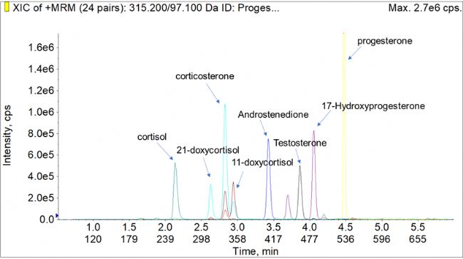 類固醇激素的檢測對質(zhì)譜儀器的性能提出了很高的要求:正常人體液樣本中的大部分類固醇激素水平極低,一般在ng/ml的水平,多種激素同時檢測更需要高選擇性、高靈敏度以及寬動態(tài)范圍的高性能質(zhì)譜平臺。