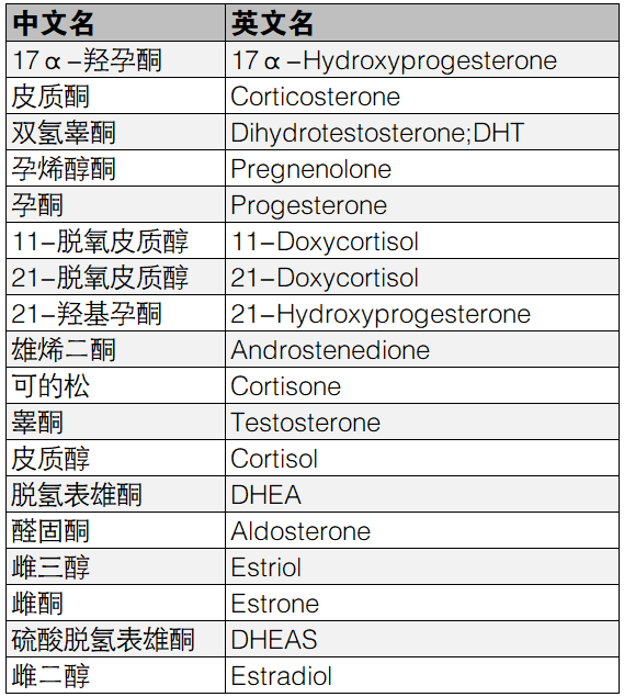 附:以上類固醇激素中英文對照表: