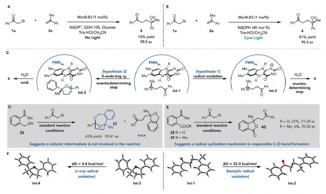 康奈爾大學(xué)的Todd K. Hyster團(tuán)隊(duì)在此前的研究中,發(fā)現(xiàn)黃素依賴的烯還原酶(“ene”-reductases,EREDs)可以通過自由基機(jī)理催化C-C鍵的形成。隨后的多項(xiàng)研究中,EREDs完成了各種不對(duì)稱還原加氫烷基化和加氫磺;磻(yīng),是一種很有潛力的酶。作者認(rèn)為,EREDs既然可以催化烯烴的加氫烷基化,那么只要將自由基淬滅的步驟,從還原型變?yōu)檠趸,就可以催化烯烴的不對(duì)稱羰基羥基化,從而制備叔醇類化合物。近日,該團(tuán)隊(duì)在JACS上發(fā)表《Asymmetric Carbohydroxylation of Alkenes Using Photoenzymatic Catalysis》的一文,就講述了這樣的故事。