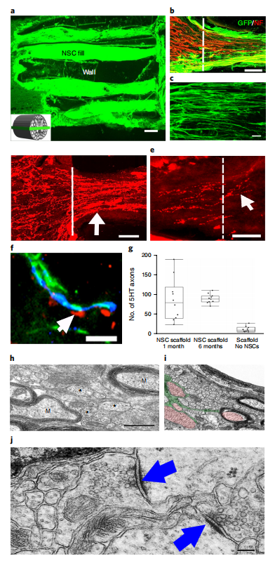 圖3 |加載npc的3d打印支架植入物4周的體內(nèi)性能。a,通道中充滿了表達(dá)gfp的npc。插入的原理圖指示了該圖中所有面板中水平截面的方向。b,通道的吻側(cè)入口被宿主軸突穿過(guò)(標(biāo)記為NF200 (NF));宿主軸突與移植物衍生軸突的區(qū)別在于不表達(dá)GFP。c,植入表達(dá)gfp的NSCs在支架內(nèi)延伸線性軸突。嘴側(cè)在左邊,尾側(cè)在右邊。d, 5ht標(biāo)記的宿主血清素能軸突從病變的嘴側(cè)(左)進(jìn)入充滿npc的通道,并在通道中線性再生(箭頭)。e, 5ht標(biāo)記的宿主軸突退出通道尾側(cè),再生到病變遠(yuǎn)端宿主脊髓中(箭頭)。白線是尾管到脊髓尾管出口的分界線。f,再生到支架通道的5HT宿主軸突與植入npc的樹(shù)突(MAP2)形成同位接觸(箭頭)(標(biāo)記為GFP)。g,定量到達(dá)支架尾端的5個(gè)ht軸突的平均數(shù)量(單尾方差分析P < 0.0322,事后Tukey’s), n = 10只動(dòng)物。這些方框顯示了25 – 75個(gè)百分點(diǎn)的范圍,中間的標(biāo)記是中位數(shù)。胡須顯示的IQR值是第25或75百分位值的1.5倍。h,在超微結(jié)構(gòu)水平上,通道內(nèi)存在不同直徑的軸突(星號(hào)),許多軸突是有髓鞘化的(M)。i,超微結(jié)構(gòu)圖像顯示少突膠質(zhì)細(xì)胞(綠色)向髓鞘化軸突發(fā)送多個(gè)過(guò)程(紅色)。j,突觸(箭頭)在通道內(nèi)的軸突和植入npc的樹(shù)突之間形成。突觸與包含圓形囊泡的突觸前扣子是不對(duì)稱的。比例尺,200 μ m (a), 50 μ m (b),10 μ m (c,f), 100 μ m (d,e),500 nm (h), 0.2 μ m (i), 200 nm (j)。