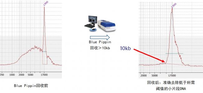 Blue Pippin 、Pippin HT程序中自帶的High Pass模式,即設(shè)定好回收的起點,系統(tǒng)可以自動回收起點以上的所有片段,干凈徹底的去除小片段DNA,有效提高Nanopore測序效率和質(zhì)量。