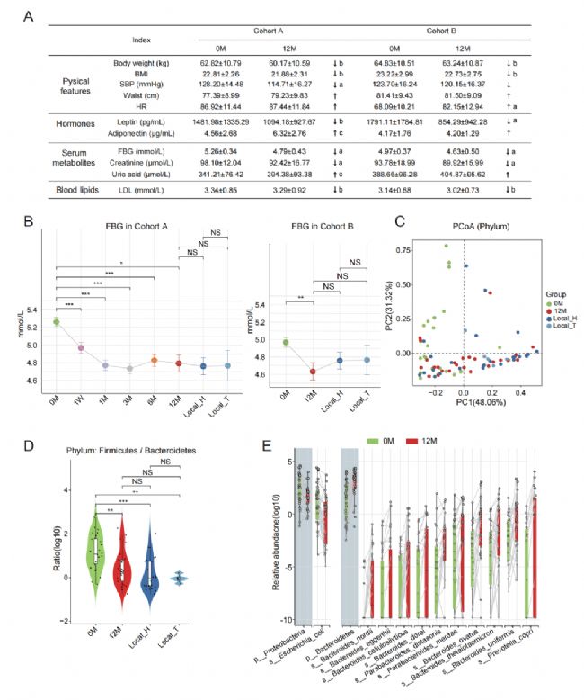 為進(jìn)一步了解腸道菌群的厭氧發(fā)酵能力,通過基因注釋獲得GMMs (Gut Metabolic Modules),與入藏前相比,入藏后12個(gè)月的腸道菌群的14個(gè)MFs增強(qiáng),11個(gè)MFs減弱,其中參與丙酸合成代謝的MF0084(Succinate conversion to propionate)、MF0093(Propionate production I)、MF0094(Propionate production II)和MF0080(Lactate consumption II)在12M組中減弱,據(jù)報(bào)道丙酸的增加與T2DM風(fēng)險(xiǎn)增加相關(guān),上述表明入藏后腸道菌群的丙酸合成能力降低。該推測通過對(duì)兩個(gè)隊(duì)列的血清丙酸進(jìn)行靶向檢測得到驗(yàn)證,且12M組的丙酸含量開始與林芝地區(qū)居住5年以上的個(gè)體變得相近(圖3 A、B)。