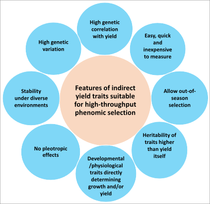 在過去的20年里,與基因組學(xué)技術(shù)并行發(fā)展的傳感器技術(shù)在表型學(xué)領(lǐng)域取得了相對迅速的進展。高通量表型學(xué)在改善作物農(nóng)學(xué)和產(chǎn)量預(yù)測方面得到了廣泛應(yīng)用,其中包括甘蔗。然而,盡管表型學(xué)是育種的核心,并且資源消耗較大,但在商業(yè)作物育種中,其應(yīng)用還處于起步階段。有趣的是,至少谷物作物方面,推動表型學(xué)創(chuàng)新的研究,有望改變育種的方式,主要是通過將表型學(xué)應(yīng)用于揭示作物生理學(xué)和植物發(fā)育中迄今難以解決的方面。例如,在谷物作物中已經(jīng)建立了利用間接性狀輔助產(chǎn)量預(yù)測的表型學(xué)方法,并且其潛在的育種應(yīng)用已在近期的綜述中強調(diào)。實際上,使用高通量表型學(xué)平臺可以量化大量與生物量積累和作物產(chǎn)量相關(guān)的植物生長、發(fā)育、生理和葉片光譜屬性,其中一些平臺現(xiàn)在已經(jīng)商業(yè)化。然而,并非所有與生物量或產(chǎn)量相關(guān)的間接性狀都適用于育種中的克隆選擇。理想情況下,適用于育種應(yīng)用的間接性狀必須具備圖中所示的一些屬性,包括與產(chǎn)量具有高遺傳相關(guān)性和貢獻度,直接與控制生長和/或產(chǎn)量的關(guān)鍵生理或發(fā)育過程相關(guān)聯(lián),具有高遺傳性、大遺傳變異性,并且可以進行高通量表型學(xué)測定。因此,融合適當(dāng)選擇的間接產(chǎn)量性狀的選擇系統(tǒng)可能有助于更大的遺傳增益和經(jīng)濟回報,因為這些性狀的遺傳性比產(chǎn)量本身還要高。