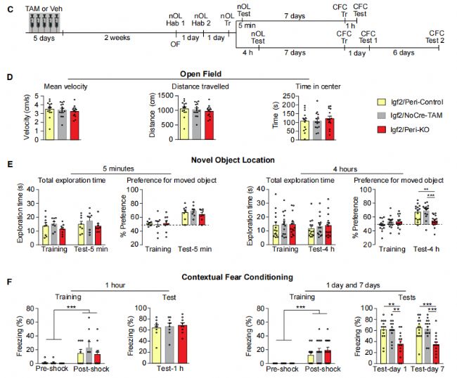 研究人員通過(guò)基因工具小鼠實(shí)現(xiàn)特異性敲除周細(xì)胞上IGF2后并不影響在新物體認(rèn)知和條件性恐懼記憶中的 短期記憶,但損壞條件性恐懼記憶中的長(zhǎng)期記憶。但是僅敲除背側(cè)海馬周細(xì)胞上IGF2后新物體認(rèn)知和條件性恐懼記憶中的 短期記憶和長(zhǎng)期記憶均受到損害。