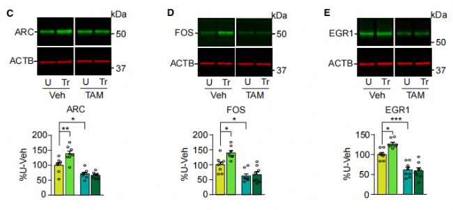 上述研究表明學(xué)習(xí)記憶促進(jìn)周細(xì)胞IGF2表達(dá)依賴于神經(jīng)元活性,他們通過(guò)分子實(shí)驗(yàn)證實(shí)了學(xué)習(xí)訓(xùn)練促進(jìn)了細(xì)胞骨架活性調(diào)節(jié)蛋白(ARC)、c-FOS蛋白、早期生長(zhǎng)應(yīng)答因子1(EGR1)蛋白水平的表達(dá)(這些蛋白調(diào)控神經(jīng)元即早基因的活性),在敲除周細(xì)胞IGF2后上述學(xué)習(xí)訓(xùn)練并不會(huì)促進(jìn)這些蛋白表達(dá)。