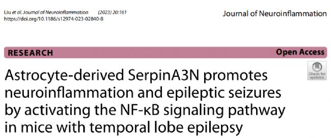 Liu C, Zhao XM, Wang Q, Du TT, Zhang MX, Wang HZ, Li RP, Liang K, Gao Y, Zhou SY, Xue T, Zhang JG, Han CL, Shi L, Zhang LW, Meng FG. Astrocyte-derived SerpinA3N promotes neuroinflammation and epileptic seizures by activating the NF-κB signaling pathway in mice with temporal lobe epilepsy. J Neuroinflammation. 2023 Jul 8;20(1):161. doi: 10.1186/s12974-023-02840-8. PMID: 37422673; PMCID: PMC10329806.