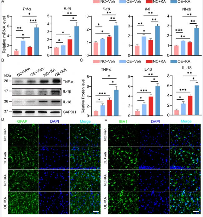 癲癇小鼠和過(guò)表達(dá)SerpinA3N的小鼠海馬中Tnf-α、Il-1β、Il-18、Il-6和Nf-κb的表達(dá)水平升高,而SerpinA3N敲低逆轉(zhuǎn)了這些變化,表明KA和SerpinA3N可單獨(dú)誘導(dǎo)炎癥因子的上調(diào)。此外,SerpinA3N過(guò)表達(dá)加重了KA注射后35 d小鼠中這些mrna的上調(diào),SerpinA3N敲低逆轉(zhuǎn)了這些變化。