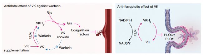在文章中作者展示了維生素 K 的完全還原形式——萘醌(包括甲萘醌和植物醌)除了作為γ-谷氨酰羧化酶的輔助因子與血液凝固有關(guān)的常規(guī)功能外,還具有很強的抗鐵死亡功能。研究發(fā)現(xiàn),鐵死亡抑制蛋白1(FSP1)是一種 NAD(P)H-泛醌還原酶,它能有效地將維生素 K 還原成氫醌,而氫醌是一種強效的自由基捕獲抗氧化劑和(磷)脂質(zhì)過氧化抑制劑。另外,F(xiàn)SP1 介導(dǎo)的維生素 K 還原對warfarin中毒也有解毒作用。由此可見,F(xiàn)SP1 是介導(dǎo)warfarin耐受的維生素 K 還原的酶。 FSP1 依賴的非經(jīng)典維生素 K 循環(huán)可保護細胞免受有害的脂質(zhì)過氧化和鐵死亡。
