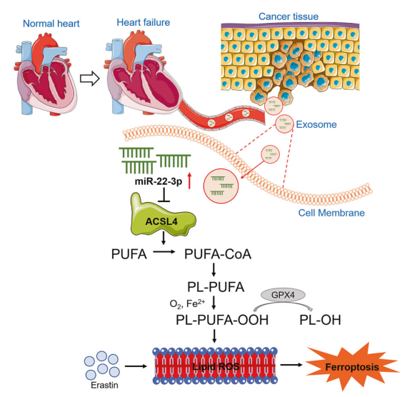 心血管疾病和癌癥一直以來都是嚴重危及生命的兩大疾病,并且心力衰竭(HF)患者通常有較高的患癌風(fēng)險。由于鐵死亡在治療耐藥性癌癥和其他退行性疾病方面發(fā)揮著重要作用,因此靶向鐵死亡被認為是癌癥治療的新途徑。外泌體對近端和遠端器官通訊至關(guān)重要,并通過旁分泌方式調(diào)節(jié)疾病的發(fā)生。然而,外泌體是否能影響癌癥對鐵死亡的敏感性尚不清楚。來自哈爾濱醫(yī)科大學(xué)的楊寶峰團隊首次揭示了心肌梗死(MI)可以通過釋放心肌細胞的miR-22-3p富集外泌體顯著抑制ACSL4蛋白的表達,從而降低腫瘤細胞對鐵死亡的敏感性。