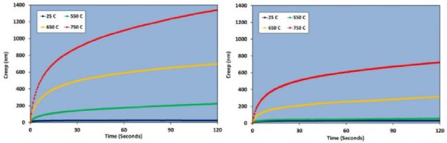 調(diào)查發(fā)現(xiàn),大多數(shù)高溫材料的失效是由高溫、高壓作用引起的高溫蠕變所致。不同材料的組織、化學(xué)成分和熱物理性能都存在著較大的差異,因此其蠕變性能的高低也不盡相同。例如,低合金鋼和不銹鋼之間的蠕變性能就存在很大的差異;诖朔N原因,研究材料的高溫蠕變特性就顯得尤為重要。而納米壓痕技術(shù)提供了一個獨特的機會來探測復(fù)雜微觀結(jié)構(gòu)材料中單個組分或相的蠕變反應(yīng),這是傳統(tǒng)的測試技術(shù)無法實現(xiàn)的。納米力學(xué)測試系統(tǒng)NanoTest Vantage(-25°C至850°C)和納米力學(xué)測試系統(tǒng)NanoTest Xtreme(-50°C至1000°C)以其行業(yè)領(lǐng)先的熱穩(wěn)定性以及測量最廣泛樣品幾何形狀的靈活性成為高溫蠕變反應(yīng)測量的不二選擇。如下圖示例: