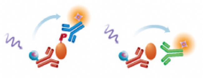 每種測(cè)定都使用夾心形式,其中兩種抗體用HTRF專用熒光團(tuán)標(biāo)記。生物標(biāo)志物檢測(cè)使用兩種對(duì)目標(biāo)蛋白質(zhì)具有特異性的抗體(參見圖 2A),而磷蛋白分為兩種測(cè)定方法(參見圖2B)。其中第一個(gè)測(cè)定方法是磷酸化試劑盒,在試劑盒中一種抗體靶向磷酸化位點(diǎn),而另一種抗體靶向整個(gè)蛋白質(zhì)。