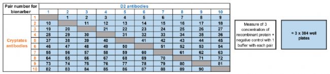 為了測(cè)試這些抗體配對(duì),我們使用重組蛋白作為生物標(biāo)志物,使用細(xì)胞裂解物作為磷酸化蛋白。這些樣品中的每一個(gè)都被稀釋兩次以評(píng)估動(dòng)態(tài)范圍。這些稀釋會(huì)在最終用戶實(shí)施的培養(yǎng)基中進(jìn)行(例如,用于分泌生物標(biāo)志物的培養(yǎng)基,或用于細(xì)胞內(nèi)磷酸蛋白的裂解緩沖液)。由于HTRF使用同質(zhì)形式的一步檢測(cè)實(shí)驗(yàn)方案,因此緩沖區(qū)組成可能對(duì)信號(hào)產(chǎn)生巨大影響。因此,我們開發(fā)了 4 種裂解緩沖液來匹配任何抗體對(duì)去污劑的敏感性。