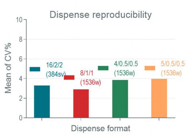 由于 MANTIS 能夠分配到 1536 孔板形式中,因此我們能夠按比例縮小 1536 孔尺寸的測(cè)定體積。