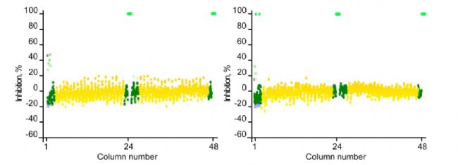 當(dāng) CTG 保留在儀器上過夜時,情況發(fā)生了巨大變化。 Multidrop Combi 管道堵塞,無法獲得數(shù)據(jù),而 TEMPEST 的再循環(huán)功能則完全避免了這一情況。此外,使用 TEMPEST 處理新鮮 CTG 的產(chǎn)生的數(shù)據(jù)(圖 3,左)與使用過夜 CTG (圖 3,右)獲得的數(shù)據(jù)幾乎沒有區(qū)別。這種一致性令人驚訝,因為根據(jù)制造商的說法,重構(gòu)的 CTG 試劑可以在室溫下儲存長達(dá)八小時,以將活性損失保持在 10% 以下。一種可能的解釋是通過再循環(huán)頻繁混合可延長 CTG 試劑的半衰期。