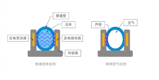 超聲波氣泡傳感器能夠檢測到是否有氣泡的存在,主要是因為管道壁或者液體與氣體之間存在較大的聲阻抗差異,這種較大的阻抗不匹配會形成一個聲鏡,可以將超聲波反射回發(fā)射器的方向,由于聲波無法到達接收端,因此當(dāng)傳感器檢測到這種情況時,就會提示有氣泡的存在。