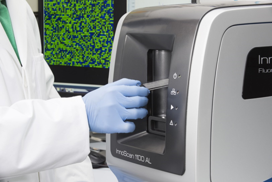 該團(tuán)隊(duì)構(gòu)建的糖芯片含有816種組份,其中包含N-和O-連接的聚糖、糖脂聚糖、糖肽、細(xì)菌和真菌聚糖以及一些天然糖蛋白。每個(gè)樣品點(diǎn)作二重復(fù),每張芯片有8個(gè)重復(fù)的微陣列。該芯片可快速分析血清中抗聚糖抗體群,包括針對(duì)外來(lái)抗原和自身抗原的抗體群。芯片制作后,采用InnoScan 1100 AL芯片掃描儀對(duì)樣品點(diǎn)形態(tài)和缺失進(jìn)行質(zhì)控。 芯片和樣品反應(yīng)后的熒光信號(hào),采用InnoScan1100AL進(jìn)行掃描檢測(cè)。