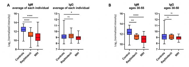 圖1. 所有聚糖的平均IgG和IgM抗體信號(hào)。(A) IgG和IgM抗體信號(hào)平均信號(hào)箱線圖,對(duì)照樣品的平均IgG為9.21個(gè)原始熒光單位(RFU)。Raybiotech新冠肺炎隊(duì)列的平均IgG信號(hào)為9.30,NIH新冠肺炎隊(duì)列的平均IgG信號(hào)值為8.90。對(duì)照組的平均IgM信號(hào)為12.41。Raybtioech新冠肺炎隊(duì)列平均IgM信號(hào)為11.21,NIH隊(duì)列的平均IgM信號(hào)為10.83。(B) 選定年齡范圍患者的IgM和IgG的平均信號(hào)箱線圖。ns,表示不顯著。箱體表示四分位數(shù),線表示最小值和最大值。