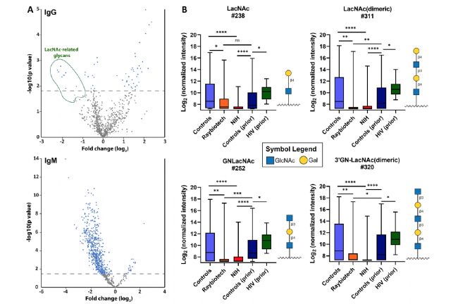 圖2:新冠肺炎患者與對(duì)照組之間的差異。(A) x軸上的平均Raybiotech新冠肺炎患者信號(hào)相比對(duì)照的倍數(shù)變化(log2)和y軸上的負(fù)P值(log10)的火山圖。虛線以上的點(diǎn)在使用20%錯(cuò)誤發(fā)現(xiàn)率的情況下具有統(tǒng)計(jì)學(xué)意義。(B)各血清樣品抗LacNAc聚糖IgG抗體平均信號(hào)箱線圖。 使用GlycoGlyph創(chuàng)建聚糖結(jié)構(gòu)。箱體表示四分位數(shù),線表示最小值和最大值。