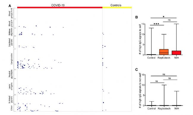 人體免疫系統(tǒng)對(duì)預(yù)防和治療新冠至關(guān)重要,但異常免疫反應(yīng)會(huì)產(chǎn)生有害影響。新冠病毒表面高度糖基化,可誘導(dǎo)人體免疫系統(tǒng)產(chǎn)生聚糖抗體。聚糖抗體可識(shí)別病毒并影響臨床結(jié)果,但其作用知之甚少。NCI癌癥研究中心的吉爾德利夫團(tuán)隊(duì)使用糖微陣列芯片,對(duì)不同隊(duì)列新冠肺炎患者血清和健康對(duì)照血清進(jìn)行抗體分析,發(fā)現(xiàn)新冠肺炎患者對(duì)自身聚糖有多種自身抗體,包括可導(dǎo)致神經(jīng)系統(tǒng)疾病的抗神經(jīng)節(jié)苷脂抗體。