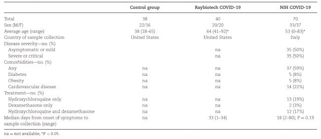 實(shí)驗(yàn)樣品中40例新冠感染患者血清來(lái)自Raybiotech公司, 70例新冠感染患者血清來(lái)自NIH,38名未感染健康個(gè)體血清作為“對(duì)照組”(表 1)。所有對(duì)照組血清樣本在SARS-CoV-2爆發(fā)前采集。