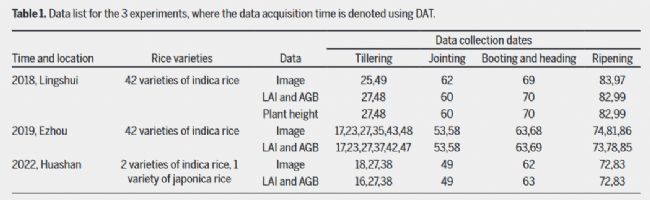 本研究的主要目的如下:(a)建立水稻的垂直分布模型,通過結(jié)合高度和VI準(zhǔn)確估算LAI,(b)開發(fā)一個(gè)光合積累模型(PAM)來準(zhǔn)確估算水稻的地上生物量(AGB),(c)提出一個(gè)簡化的光合積累模型(SPAM),同時(shí)確保水稻生物量估算的精確性,(d)測試這兩個(gè)模型在不同年份獲得的數(shù)據(jù)上的可遷移性,比較不同方法在預(yù)測AGB方面的性能,并為它們在不同需求下的應(yīng)用提供建議。三次試驗(yàn)均采用2018年陵水和2019年鄂州實(shí)驗(yàn)采集的數(shù)據(jù)進(jìn)行建模,2022年華山實(shí)驗(yàn)作為驗(yàn)證集進(jìn)行模型遷移(表1)。為了更全面地測試模型,2022年在華山專門設(shè)置了一個(gè)粳稻品種,以測試本研究模型的可推廣性和魯棒性。