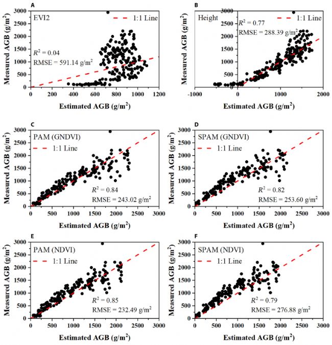 圖2 基于( A ) EVI2模型、( B )高度模型、( C ) GNDVI的PAM、( D ) GNDVI的SPAM、( E ) NDVI的PAM、( F ) NDVI的SPAM建立的模型預(yù)測的2022年和2019年樣本的地上生物量實(shí)測值與預(yù)測值( g / m² )。紅色虛線表示預(yù)期的1:1關(guān)系。