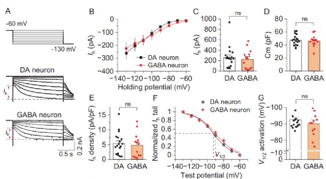 圖1:VTA多巴胺能和抑制性神經(jīng)元HCN通道電流(Ih)并無差異