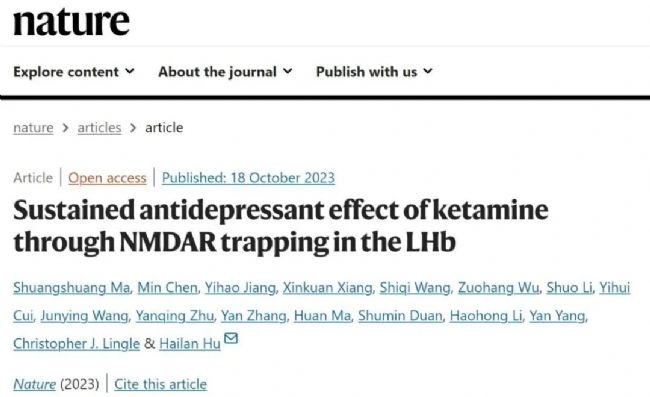 繼2018年兩篇背靠背《Nature》長(zhǎng)文揭示氯胺酮快速抗抑郁機(jī)制后,2023年10月18日,浙江大學(xué)腦科學(xué)與腦醫(yī)學(xué)學(xué)院、雙腦中心胡海嵐教授團(tuán)隊(duì)再次在《Nature》雜志上發(fā)表題為“Sustained Antidepressant Effect of Ketamine through NMDAR Trapping in the LHb”的研究論文。該研究工作在前期快速抗抑郁作用機(jī)制的基礎(chǔ)之上,進(jìn)一步回答了氯胺酮長(zhǎng)時(shí)程抗抑郁的作用機(jī)制。這一研究成果完善了團(tuán)隊(duì)先前提出的以外側(cè)韁核為核心的氯胺酮抗抑郁作用腦機(jī)制,形成了更為全面完整的理論體系,為優(yōu)化氯胺酮的臨床用藥策略,開發(fā)新型用藥方案提供了理論指導(dǎo)。