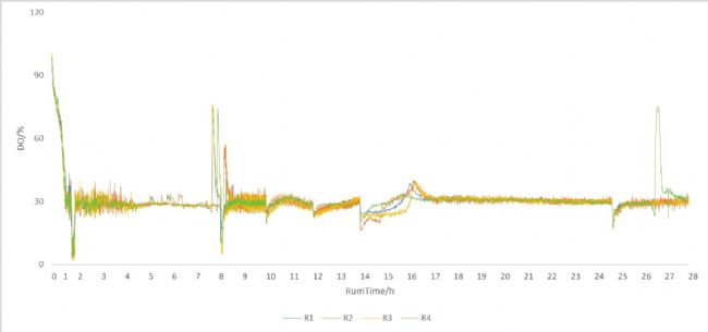 結(jié)果表明:該批發(fā)酵運(yùn)行28h后OD600在92-96.3,無論發(fā)酵結(jié)果還是過程控制的平行性均表現(xiàn)良好。